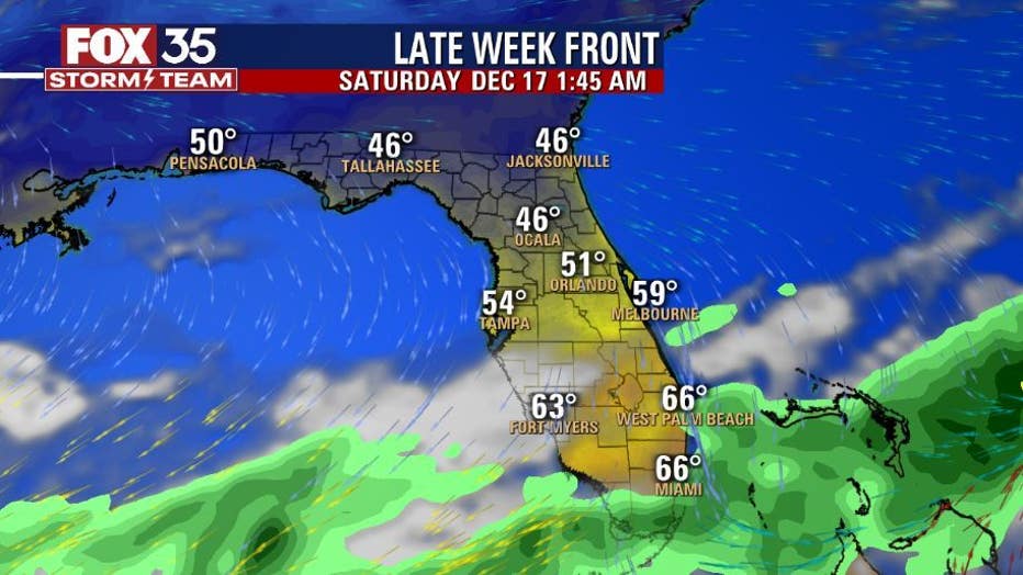 Thursday is a FOX 35 Impact Day. There is a threat for heavy rain, lightning, damaging winds and an isolated tornado across central Florida Thursday afternoon/evening. Behind the front, expect the coolest air of the season with lows into the 40s Saturday morning. Highs will be in the 60s during this time.