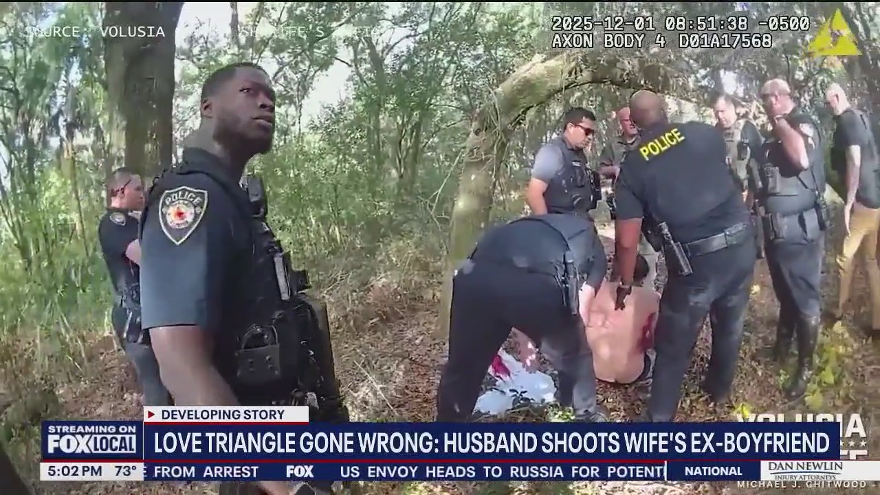 Volusia County body camera footage shows a wounded home invasion suspect in the woods in DeLand on Dec. 1, 2025.