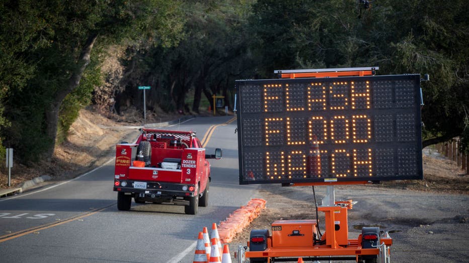 SILVERADO CANYON, CA - January 28: A fire vehicle passes by a sign warning Silverado Canyon residents who were affected by the Bond Fire of a flash flood watch and voluntary evacuation in advance of an approaching heavy rain storm that could bring mu