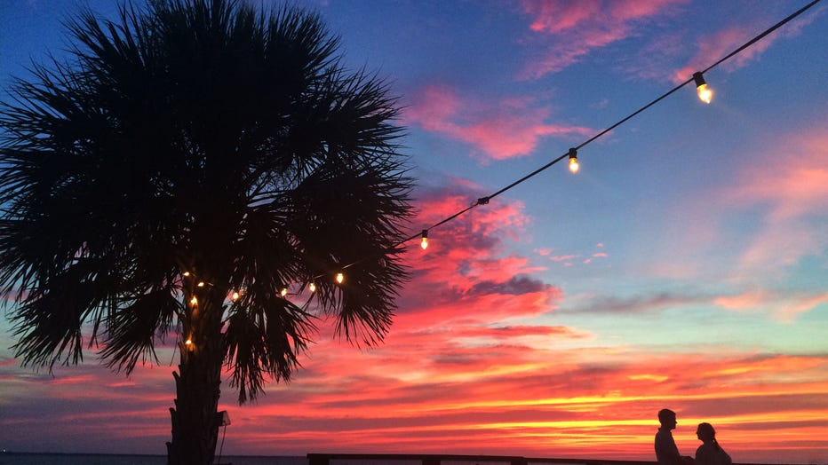 A couple enjoys a beautiful sunset along Pensacola Beach, Florida taken in July, 2015.