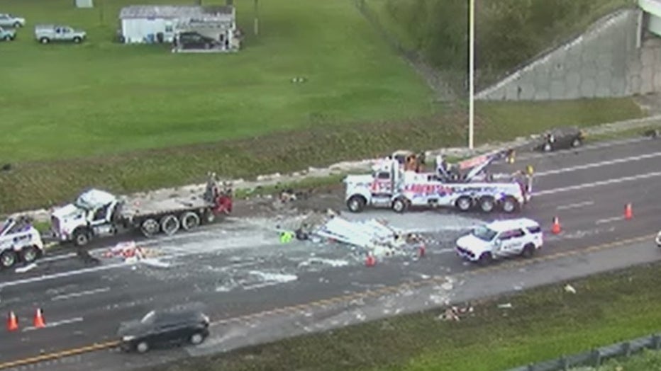 As a result, the flat-bed truck overturned, trapping its driver and the pickup truck collided with a semi that was parked along the shoulder, FHP said.