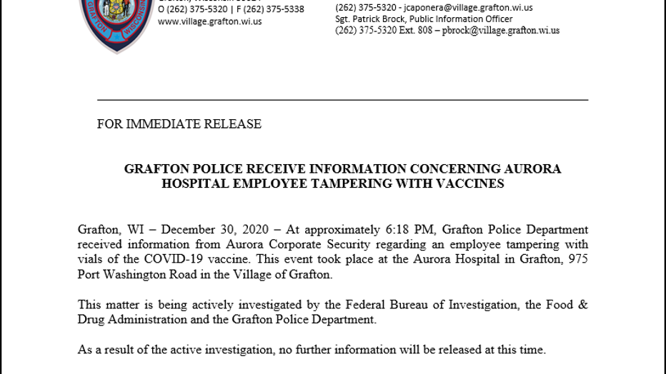 "Earlier this week, we learned that 57 vials of Moderna vaccine were removed from a pharmacy refrigerator at Aurora Medical Center - Grafton overnight, resulting in more than 500 doses of vaccine being discarded. We immediately launched an internal review and were led to believe this was caused by inadvertent human error. The individual in question today acknowledged that they intentionally removed the vaccine from refrigeration. We have notified appropriate authorities for further investigation. We continue to believe that vaccination is our way out of the pandemic. We are more than disappointed that this individual’s actions will result in a delay of more than 500 people receiving their vaccine. This was a violation of our core values, and the individual is no longer employed by us."