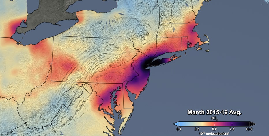 Nitrogen dioxide pollution, emitted by motor vehicles, power plants and industrial facilities, is down 30% in the Northeastern United States, according to NASA.