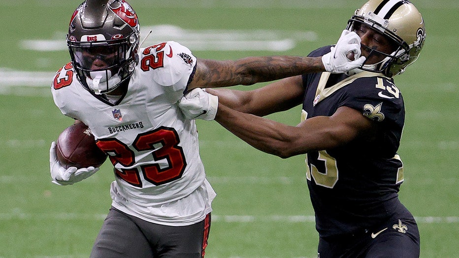 Sean Murphy-Bunting stiff-arms Michael Thomas as he runs with the ball after intercepting a pass thrown by Drew Brees. (Photo by Chris Graythen/Getty Images)