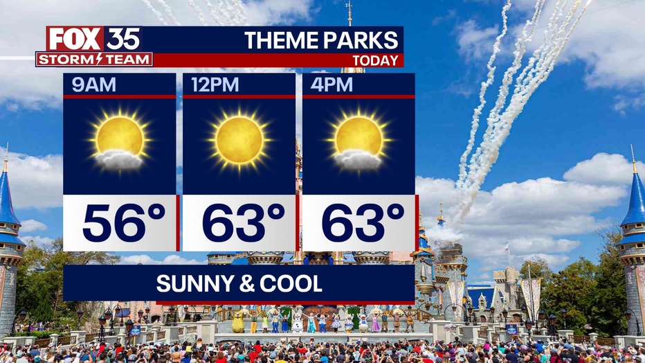 THEME PARKS: Nice day at the attractions as sunshine dominates and temps remain cool. Highs hit near 65 park side today so don't forget a light jacket or sweater for the day ahead!