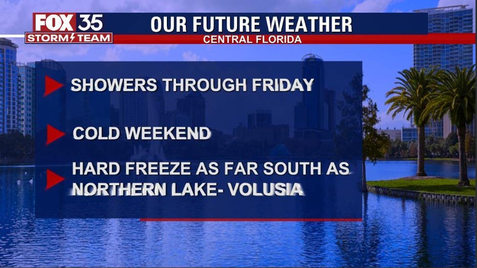 Lows behind the front on Friday will fall into the mid to upper 30s. On Sunday morning, temperatures will drop to the lowest that we have seen in four years into the 20s for northern portions of our viewing area and below-freezing temperatures around Orlando.