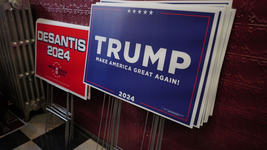 DECORAH, IOWA - JANUARY 07: Campaign yard signs sit against the wall at Club 45, the Winneshiek County Republican Party headquarters, before a visit by Republican presidential candidate businessman Vivek Ramaswamy on January 07, 2024 in Decorah, Iowa