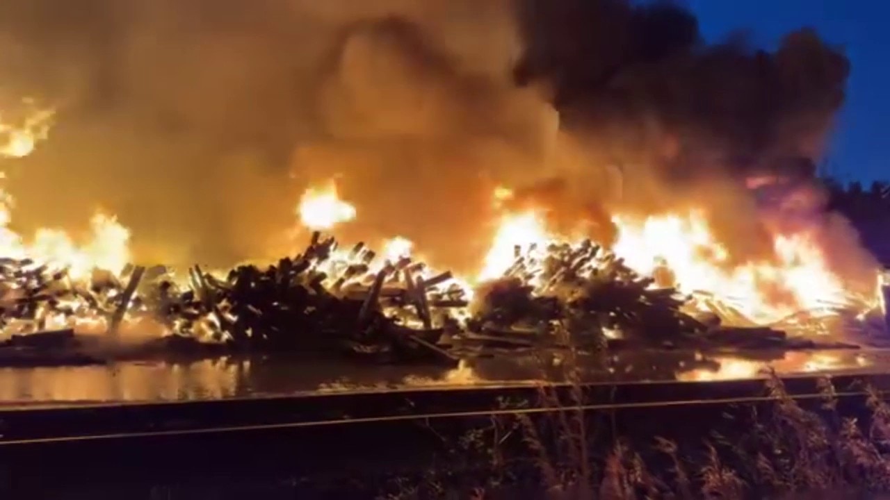 A large stockpile of treated railroad ties has caught fire in Marion County, sending large plumes of smoke into the air, according to Marion County Fire Rescue. Officials warn that because the railroad ties have been treated with creosote – an industrial wood preservative – it can produce heavy, irritating smoke.