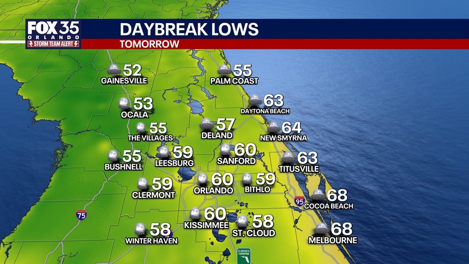 Wednesday morning lows will dip down into the low to middle 50s northwest of I-4 and into the low and middle 60s southwest of I-4.