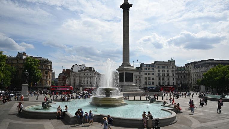 Pedestrians cool off with their feet in the water of the Trafalgar Square fountain, in central London, on July 13, 2022, during a heatwave. - Britain issued, on July 13, 2022 an extreme heat warning, with temperatures predicted to hit more than 30 de