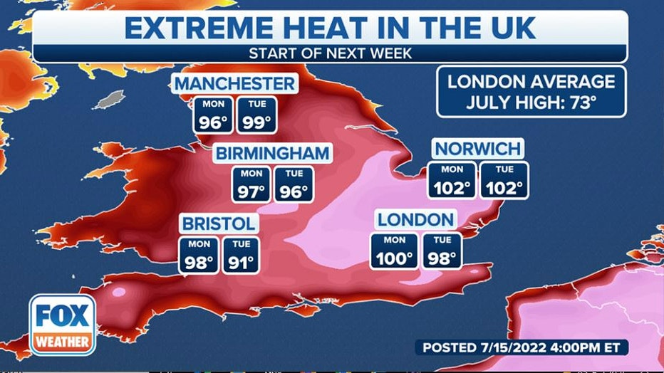 Forecast highs for the United Kingdom, July 18, 2022. (FOX Weather)