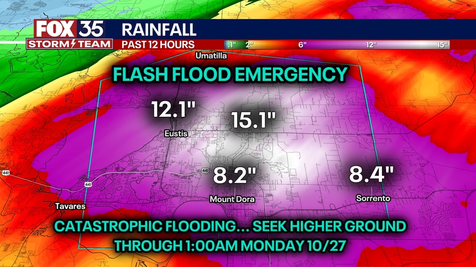 FOX 35 meteorologist Laurel Blanchard explains how much rain (estimated) has fallen in parts of Lake County over the last 12 hours, which led to a flash flood emergency being issued Sunday night.