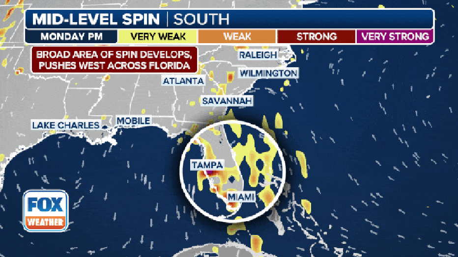 "You'll note that little cinnamon bun swirl (on forecast model charts) that moved kind of right across the (Florida) Peninsula and into the Gulf," said FOX Weather Meteorologist Michael Estime. "It's that mid-level spin right there that we're tracking that could - let me emphasize, could – by the time we get to this upcoming midweek, have some sort of tropical characteristics with it."