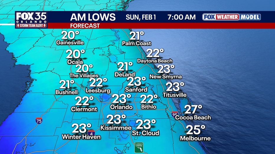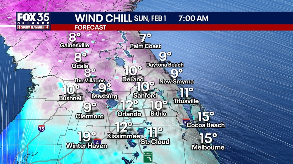 Dangerously cold wind chills as low as 7 degrees will be possible, according to the National Weather Service. Orlando will see low temperatures below freezing for three of the next five mornings.
