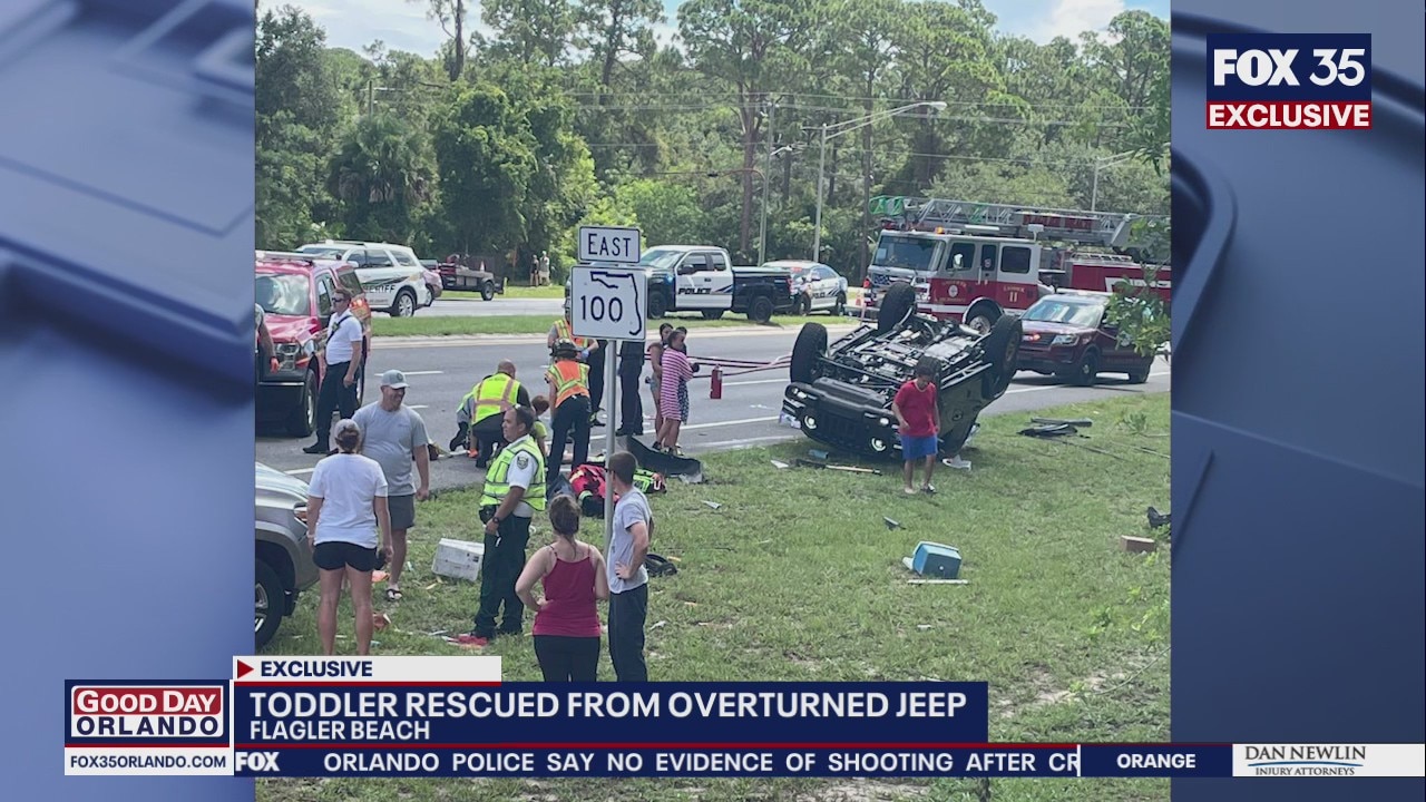 Photos from the scene show the Jeep that the toddler was riding in overturned on State Road100 and John Anderson Blvd., according to the Flagler Beach Fire Department.