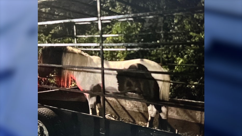 Surveillance video shared by police appears to show someone get on the trailer, get the horse, and then ride away on a bike with the horse following slowly behind them.