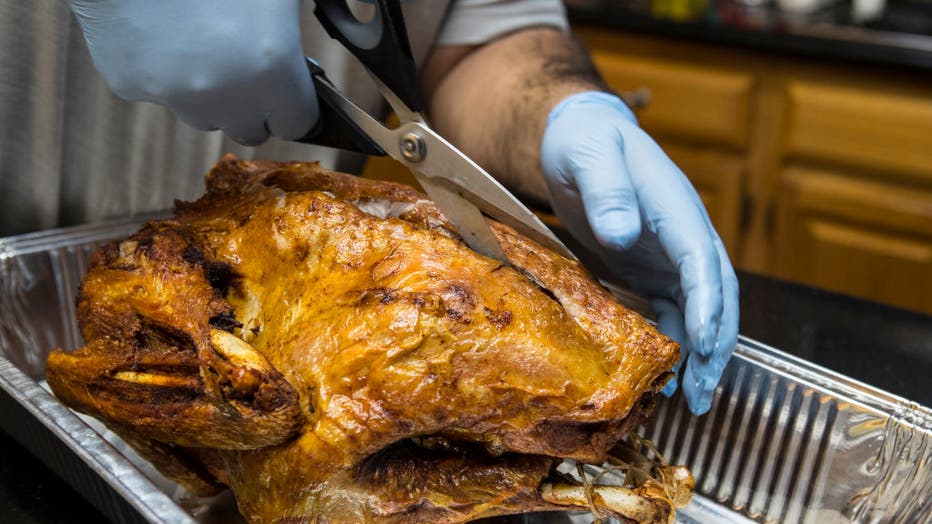 Colombo Forero cuts up a fried turkey while preparing a Thanksgiving meal for victims of Hurricane Harvey, at his home, on Monday, Nov. 20, 2017, in Friendswood. Forero will and his wife will take Thanksgving meals to about 200 people displaced by th