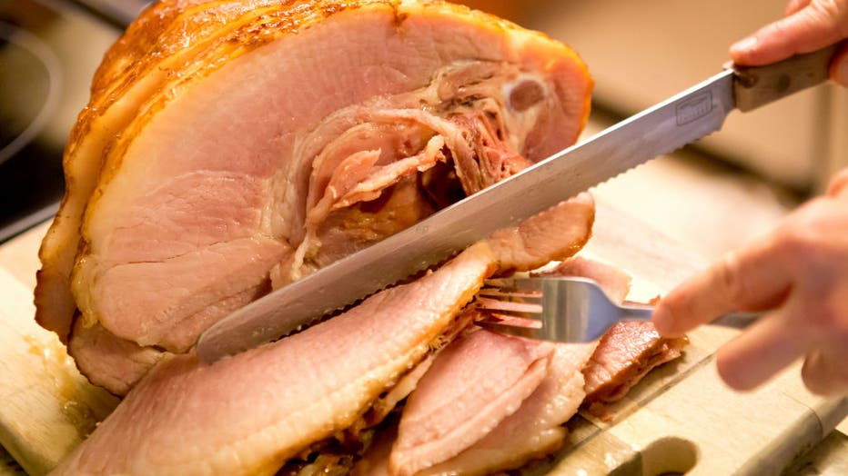 (GERMANY OUT) Hands and knife, cutting ham at thanksgiving. (Photo by Dünzlullstein bild via Getty Images)