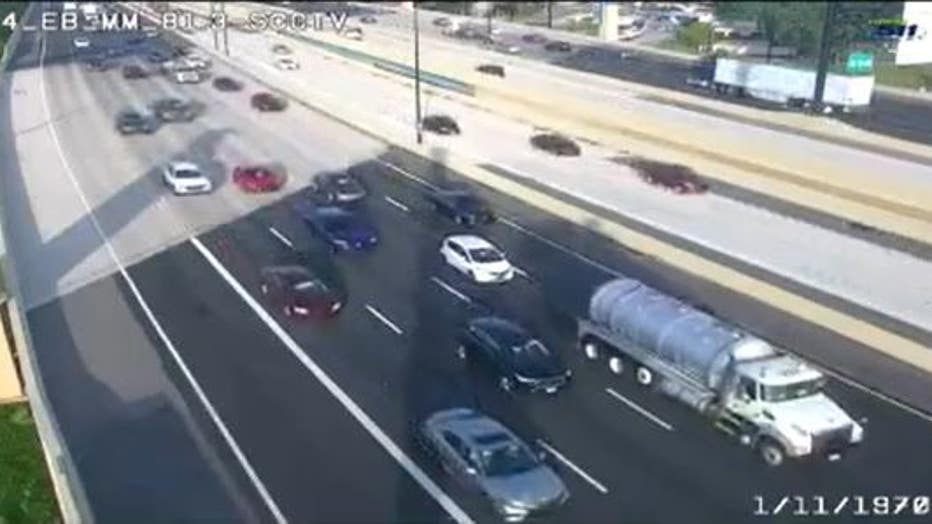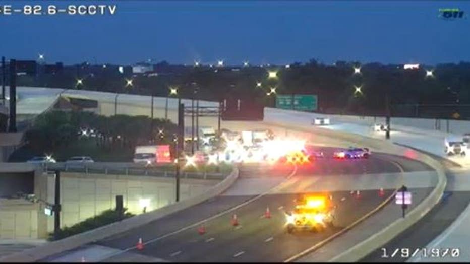 A jackknifed truck was seen blocking some lanes and another truck was apparently involved in the incident, as seen on live traffic cams.