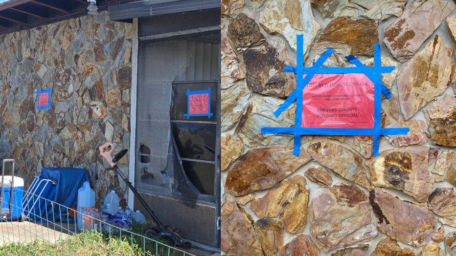 Signs are taped on the exterior of the property and behind torn screens, declaring that the property is unsafe to enter due to a Brevard County building code violation.