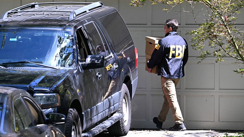 File: An FBI agent carries boxes at Donald Trump's former national security advisor John Bolton's house, as the FBI conducted a court-authorized search at his place on August 22, 2025 in Bethesda, Maryland. (Photo by SAUL LOEB/AFP via Getty Images)