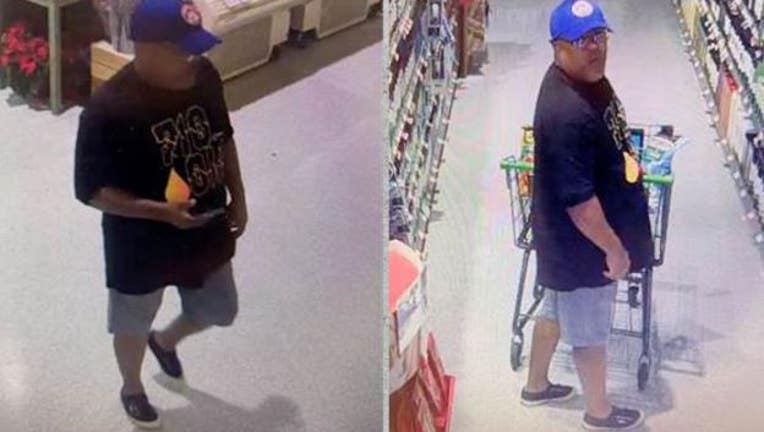 FORT MYERS, Fla. - Crime Stoppers in Southwest Florida are sharing surveillance photos of a man accused of stealing 12 bottles of wine from Publix on social media in hopes someone can identify him.