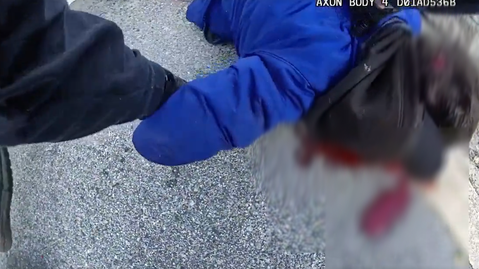 Body camera video shows Wells ordering the man not to move as he pinned him down until police arrived. Officers can be heard repeatedly asking about the location of the knife before taking the suspect into custody.