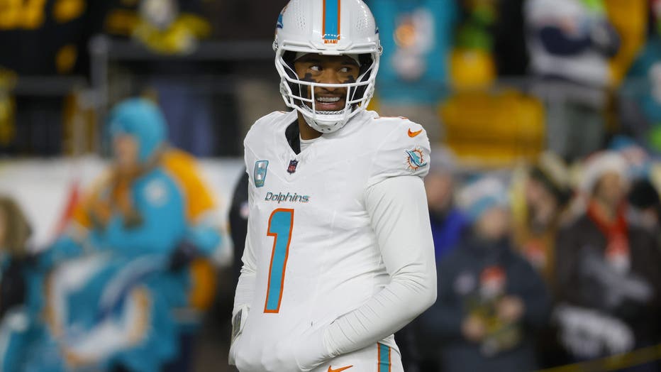 PITTSBURGH, PENNSYLVANIA - DECEMBER 15: Tua Tagovailoa #1 of the Miami Dolphins looks on prior to the game against the Pittsburgh Steelers at Acrisure Stadium on December 15, 2025 in Pittsburgh, Pennsylvania. (Photo by Justin K. Aller/Getty Images)