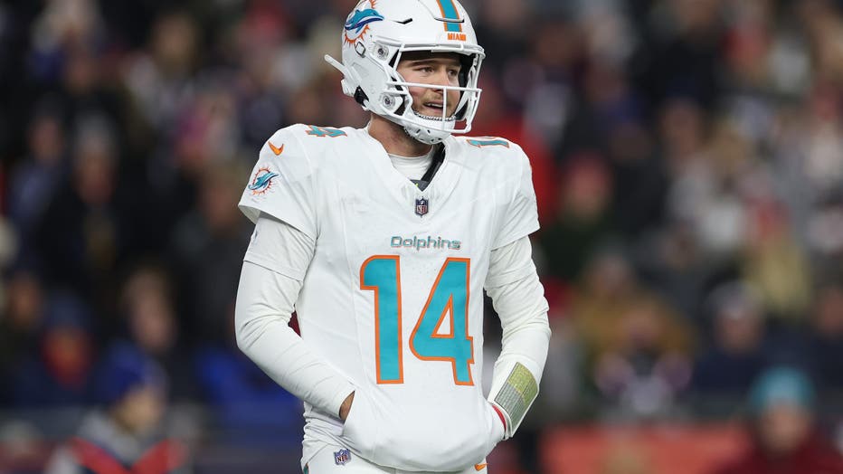 FOXBOROUGH, MASSACHUSETTS - JANUARY 04: Quinn Ewers #14 of the Miami Dolphins in action during the game against the New England Patriots at Gillette Stadium on January 04, 2026 in Foxborough, Massachusetts. (Photo by Sarah Stier/Getty Images)