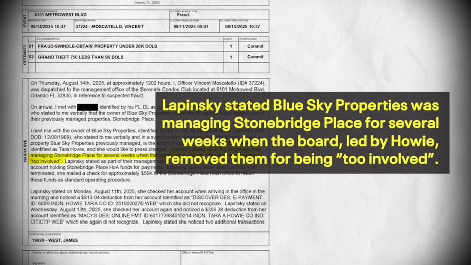The company that managed Stonebridge Place prior, BlueSky, saw that activity being made within the HOA’s accounts and reported Howie to the Orlando Police Department for fraud. They explained to responding officers that they’d been fired "for being ‘