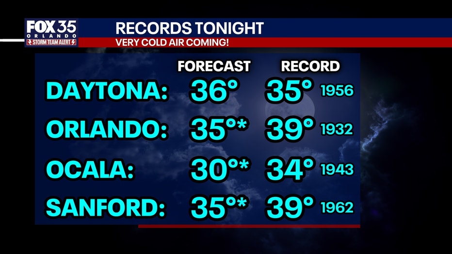 FOX 35 Storm Team Senior Meteorologist Noah Bergren is tracking record setting cold air tonight in central Florida.