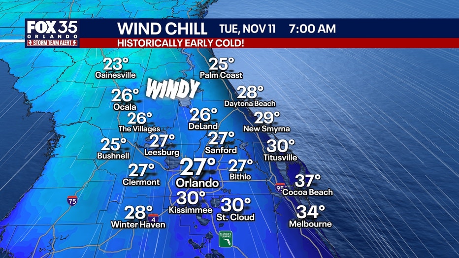 In Orlando and Central Florida, temperatures are expected to fall into the 30s and 40s. The entire region will see gusty winds up to 30 mph, which will mean wind chills in the 20s and 30s.