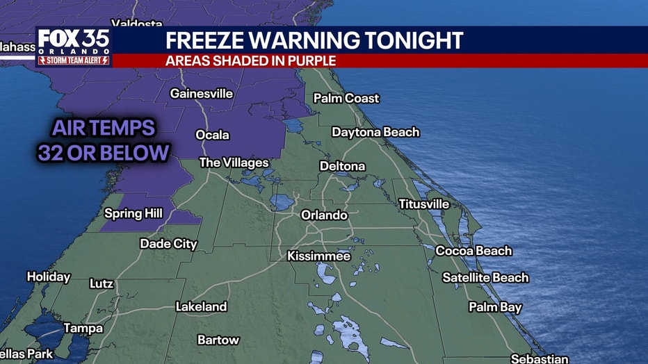 The areas where it will be the coldest will be Marion County (Ocala) and Northern Sumter County (The Villages), where temperatures could actually dip to or below the freezing mark, which is 31-32°.