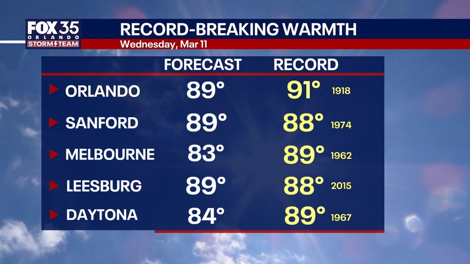 ORLANDO, Fla. - Orlando reached 90 degrees on Tuesday, March 10, marking the first 90-degree day of the year. It also tied the 108-year-old daily heat record set back in 1918.