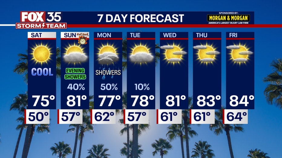 A few rain showers are now expected to move in from the Gulf just after sunset Sunday. Major rain or storms does not look to be in the cards as of now, but we will watch for any changes given recent extreme flooding in Lake and Brevard from last weekend.