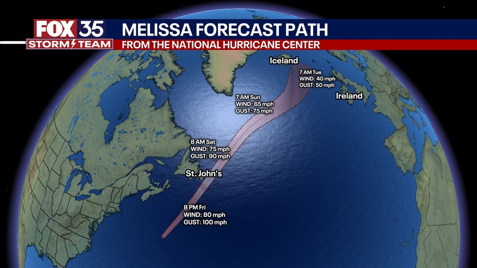 Melissa is now a "post-tropical" storm, meaning it still is producing tropical storm force winds (39+ MPH) -- but it is not a storm of tropical characteristics anymore. It will brush by St. John's in Newfoundland tonight into tomorrow. After Melissa, the tropical Atlantic is quiet for the next 7 days. The next name up: "Nestor" then "Olga."