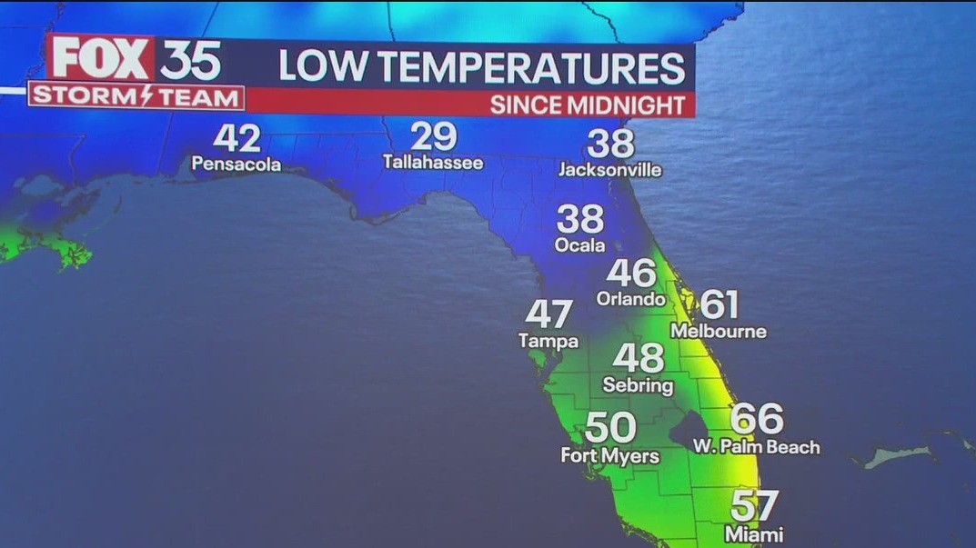 ORLANDO, Fla. - Mostly cloudy and breezy conditions will prevail on Thursday. A few sprinkles are possible along the I-95 corridor. NE winds at 10-20 mph with higher gusts expected all night. A big spread in temperature, staying in the 60s along the beaches, with 40s from Ocala up to Gainesville.