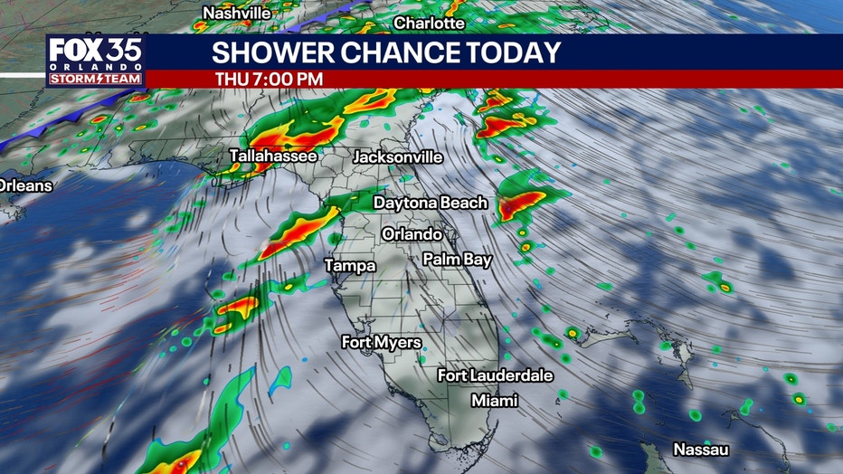 ORLANDO, Fla. - Variably cloudy skies with scattered showers, especially this afternoon and evening. South wind 8-15 mph. High 80°.