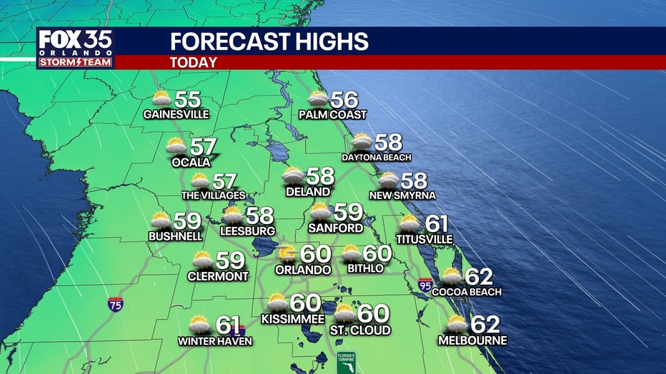 Highs today will reach the middle and upper 50s for areas northwest of I-4 and closer to the low 60s for areas along and southeast of I-4. In Orlando, we'll see a high of 60°, which is well below our average high of 72°.
