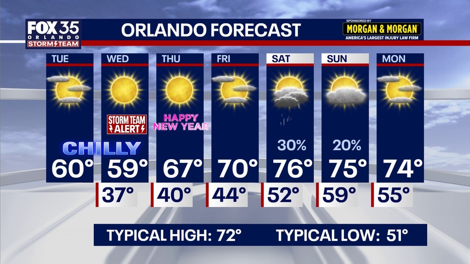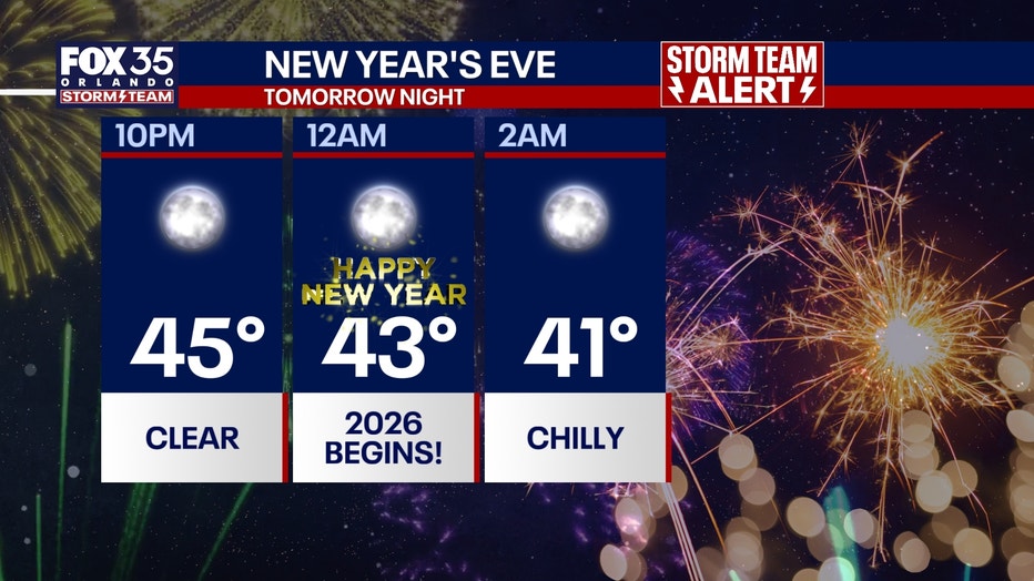 Temperatures in Orlando will only reach a high of 60° Wednesday before dipping down to around 43° as the ball drops at midnight.