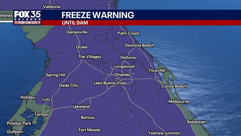A Freeze Warning is in place for all counties (except coastal Brevard County) until 9 a.m. to account for temperatures near or below the freezing mark.