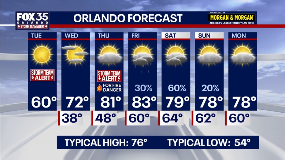 FOX 35 STORM TEAM ALERT: A combination of low humidity, gusty winds and worsening drought will combine for a high threat of brush fires between noon and 6 p.m. Any flames that breakout could quickly spread out of control.