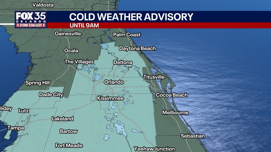 A Freeze Warning is in place for Sumter and Marion counties, points north; Cold Weather Advisories for Orlando for wind chill. The advisories end at 9 a.m.