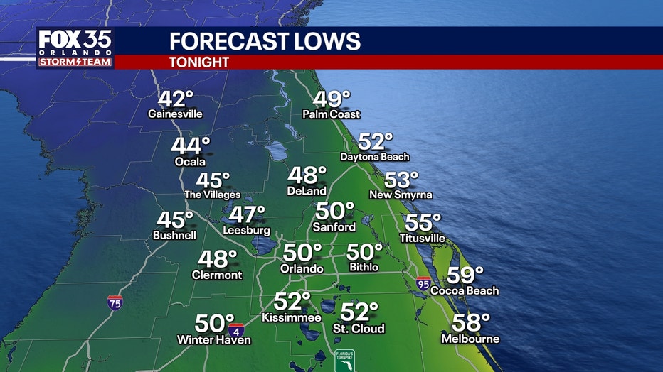 How chilly will it get tonight? Temperatures here in Orlando will be chilly with temperatures dropping into the low 50s. Areas near Gainesville and Ocala will drop into the low and mid 40s.