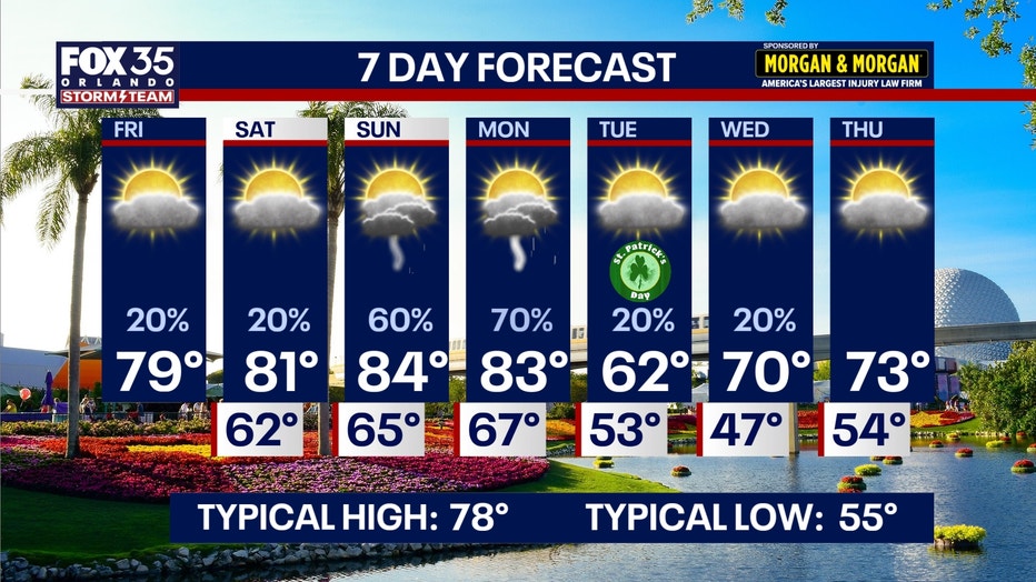 Temps cool down with the help of the NNE wind, but highs will still be able to rise back into the upper 70s and lower 80s. These readings will be much closer to normal for just about mid-March. It'll be less humid too, and overall much drier compared to our Thursday.