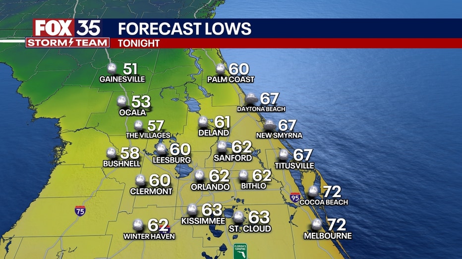 It will be mostly clear, cool and crisp tonight. Lows will fall into the 60s for most. A few spots could fall into the 50s near Marion and Flagler Counties.