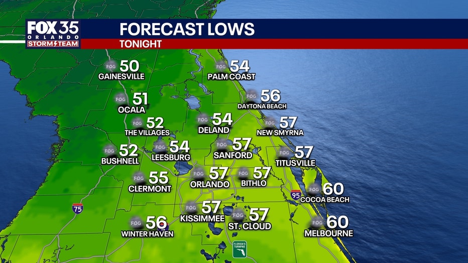 A few passing clouds are expected this evening and overnight, with patchy dense fog possibly developing again across parts of Florida. Overnight temperatures are forecast to fall into the 50s statewide.
