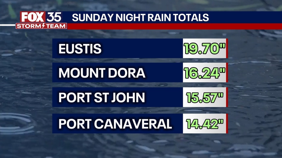 Areas of Brevard County and Lake County received several inches of rain in Sunday's storms – more than a foot of rain in some spots.