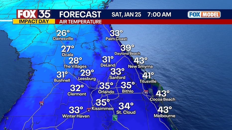 Patchy frost will be possible early Saturday morning as temperatures in some areas fall to near, or even below, the freezing mark. Areas to the northwest of Interstate 4 are under a Freeze Warning, which will be where the coldest temperatures in Central Florida will take place.