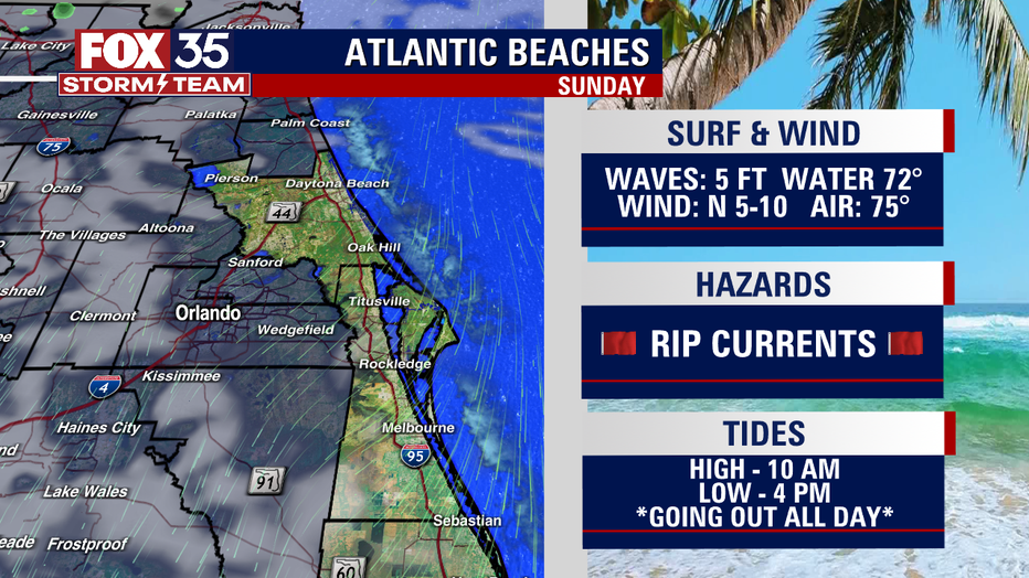 BEACHES: The high rip current risk continues today all along our coastline. Surf is in the 5-6' range as east-northeast swell comes into the beaches. Rip current risk is high at all beaches. Temps beach side hit in the low to mid 70s, water temps are near 70. Another swell increase this week will add to the risk.
